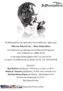 Την Δευτέρα στις 19:30 το βιβλιοπωλείο Βιβλιοτρόπιο διοργανώνει εκδήλωση-αφιέρωμα στον Νίκο Καζαντζάκη με τίτλο “Βίος και πολιτεία του . . . Νίκου Καζαντζάκη”.