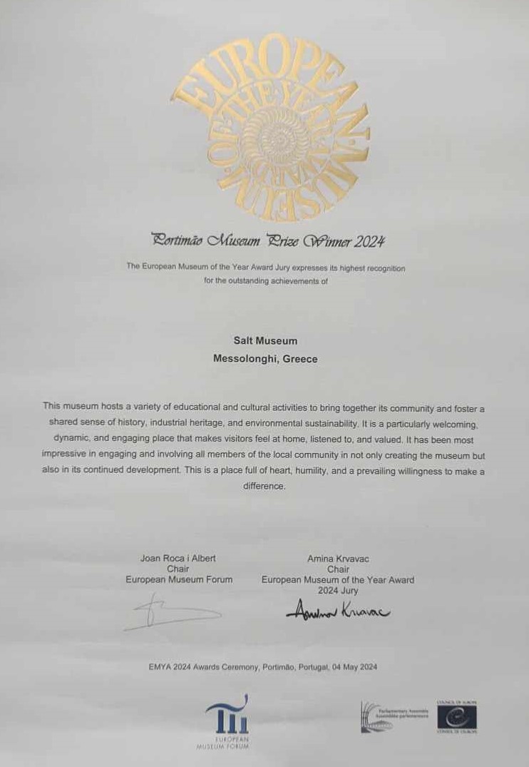 Έτσι την περασμένη εβδομάδα, στο πλαίσιο ανάδειξης του Μουσείου της χρονιάς 2024, το European Museum Forum, που υπάγεται στο Συμβούλιο της Ευρώπης, σε επίσημη τελετή που πραγματοποιήθηκε στην Πορτογαλία απένειμε το βραβείο Portimão στο Μουσείο Άλατος.
