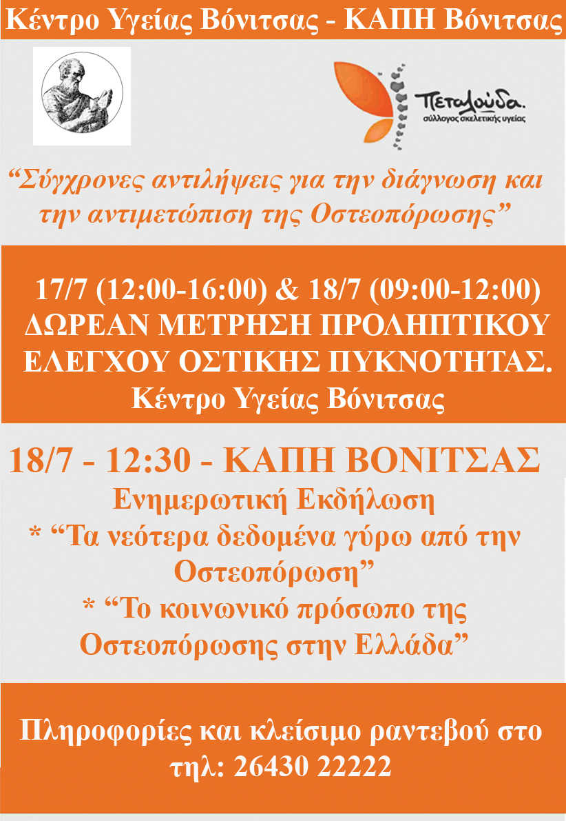 Το ΚΕΝΤΡΟ ΥΓΕΙΑΣ ΒΟΝΙΤΣΑΣ σε συνεργασία με τον ΣΥΛΛΟΓΟΣ ΣΚΕΛΕΤΙΚΗΣ ΥΓΕΙΑΣ, ΠΕΤΑΛΟΥΔΑ το ΚΕΝΤΡΟ ΚΟΙΝΩΝΙΚΗΣ ΜΕΡΙΜΝΑΣ ΚΑΙ ΑΝΑΠΤΥΞΗΣ του ΔΗΜΟΥ ΑΚΤΙΟΥ ΒΟΝΙΤΣΑΣ και το ΚΑΠΗ ΒΟΝΙΤΣΑΣ διοργανώνουν σημαντική εκδήλωση προληπτικού ελέγχου και ενημέρωσης για την οστεοπόρωση το διήμερο 17 (Τρίτη) και 18 (Τετάρτη) Ιουλίου 2018 με γενικό θέμα: