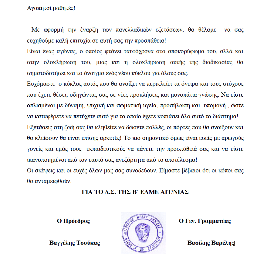 Β ΕΛΜΕ Αιτ/νίας: Ευχές προς τους μαθητές που διαγωνίζονται στις πανελλήνιες εξετάσεις