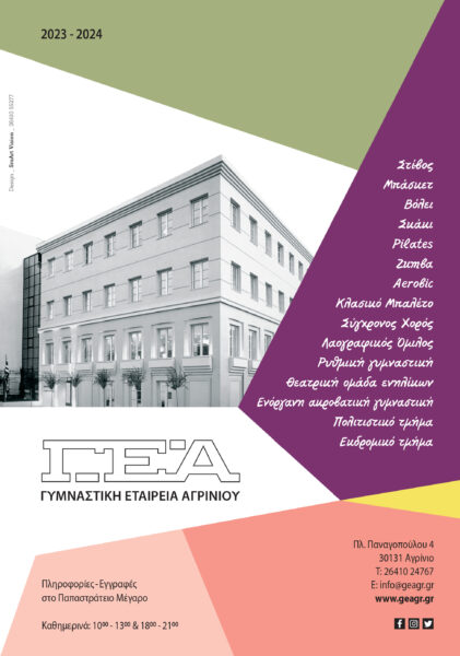 Η Γυμναστική Εταιρεία Αγρινίου ενημερώνει ότι από την 1η Σεπτεμβρίου ξεκινούν οι εγγραφές σε όλα τα τμήματά της, οι οποίες θα πραγματοποιούνται στο ισόγειο του Παπαστρατείου Μεγάρου καθημερινά (Δευτέρα έως Παρασκευή) 10:00-13:00και 18:00-21:00.