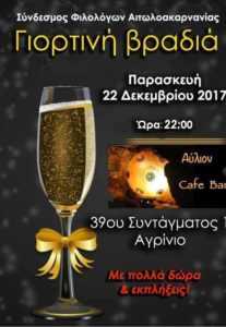 Ο Σύνδεσμος Φιλολόγων Αιτωλοακαρνανίας σας προσκαλεί στη γιορτινή βραδιά που διοργανώνει στις 22 Δεκεμβρίου 2017, ημέρα Παρασκευή και ώρα 22:00, στο café «Αύλιον» .