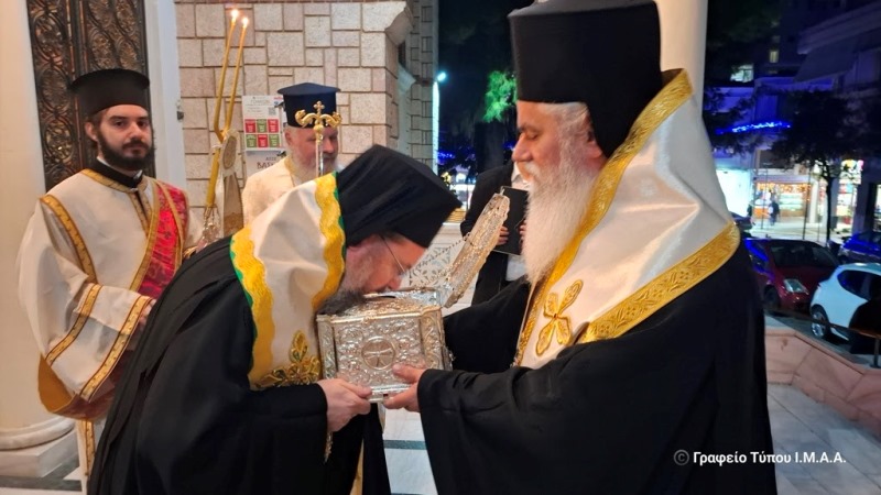 Αρχικά, στα προπύλαια του Ιερού Ναού πραγματοποιήθηκε η υποδοχή της Τιμίας και Χαριτοβρύτου Κάρας του Οσίου, την οποία εκόμισε ο Μητροπολίτης Καλαβρύτων προς ευλογία και αγιασμό των πιστών. Της υποδοχής προέστη ο Σεβασμιώτατος Μητροπολίτης Αιτωλίας και Ακαρνανίας κ. Δαμασκηνός.