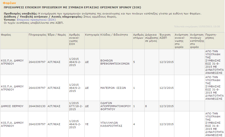 Πληροφορίες για τις προσλήψεις εποχικού προσωπικού με σύμβαση εργασίας ορισμένου χρόνου :