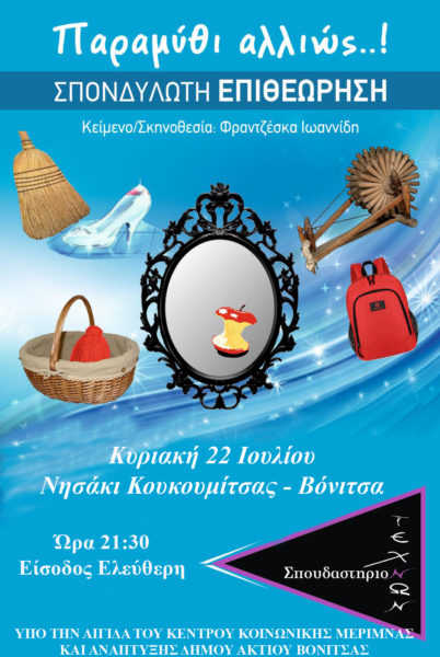 Η θεατρική επιθεώρηση «Παραμύθι αλλιώς» θα παρουσιαστεί την Κυριακή 22 Ιουλίου 2018 στις 21.30 στο Νησάκι Κουκουμίτσας με ΕΙΣΟΔΟ ΔΩΡΕΑΝ.