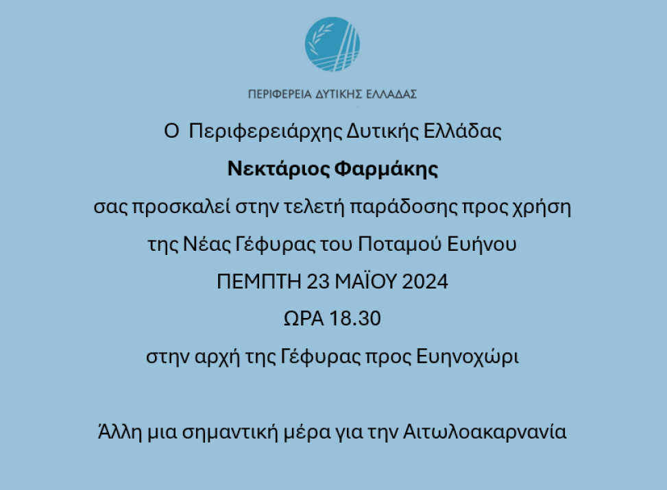 Ένα έργο τεχνικά απαιτητικό αλλά καίριας σημασίας, η Γέφυρα του Ευήνου στο Ευηνοχώρι, επιτέλους ολοκληρώθηκε και δίνεται στην κυκλοφορία αύριο Πέμπτη, 23 Μαΐου 2024. Πλέον λαμβάνει τέλος η ταλαιπωρία των διερχόμενων οδηγών από την Εθνική Οδό Αντιρρίου-Μεσολογγίου και επιτρέπεται και πάλι η απρόσκοπτη κυκλοφορία και επικοινωνία σε ένα κομβικό σημείο του Δήμου Ιερής Πόλης Μεσολογγίου αλλά και ολόκληρης της Αιτωλοακαρνανίας και της Δυτικής Ελλάδας.