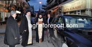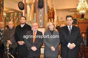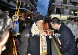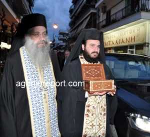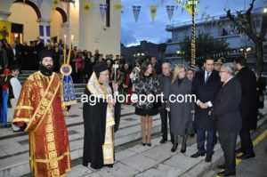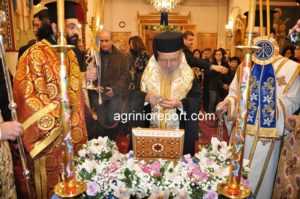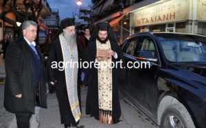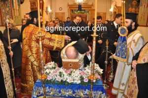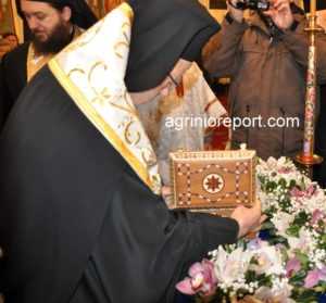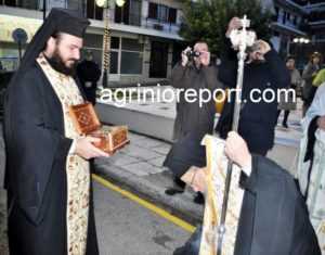 Στα προπύλαια του Ιερού Ναού ο Σεβασμιώτατος Μητροπολίτης Αιτωλίας και Ακαρνανίας κ. Κοσμάς, επικεφαλής του κλήρου και του πιστού λαού υποδέχθηκε το Ιερό Λείψανο, παρουσία του Διευθυντού του Γραφείου τύπου της Ιεράς Συνόδου της Εκκλησίας της Ελλάδας, της Αντιπεριφερειάρχη, του Δημάρχου Αγρινίου, πολιτευτών, αντιδημάρχων, του Διοικητού του Γ.Ν. Αγρινίου, εκπροσώπων των Σωμάτων Ασφαλείας και πλήθος πιστών.
