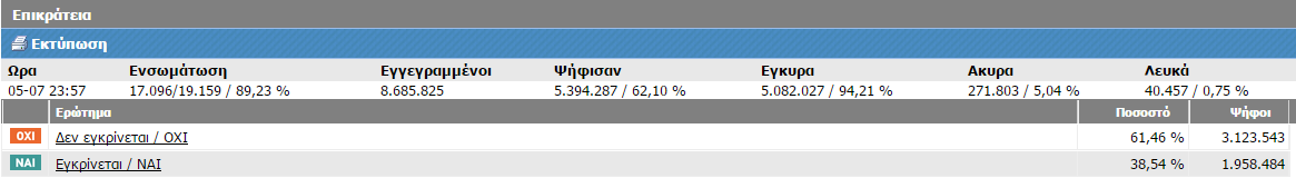 Το agrinioreport.com σας παρουσιάζει σε πραγματικό χρόνο τα αποτελέσματα του δημοψηφίσματος για την Περιφέρεια Δυτικής Ελλάδας καθώς και για ολόκληρη τη χώρα.
