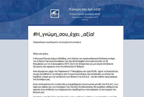 Η Κεντρική Ένωση Δήμων Ελλάδος, στο πλαίσιο του προσυνεδριακού διαλόγου που διεξάγεται ενόψει του Ετήσιου Τακτικού Συνεδρίου της, που θα πραγματοποιηθεί στα Ιωάννινα από τις 30 Νοεμβρίου ως τις 2 Δεκεμβρίου 2017, καλεί τους αιρετούς και τα στελέχη της Τοπικής Αυτοδιοίκησης να συμμετάσχουν σε δημόσια διαβούλευση, για μια σειρά από βασικά ζητήματα που αφορούν στην Αυτοδιοίκηση Α’ Βαθμού.