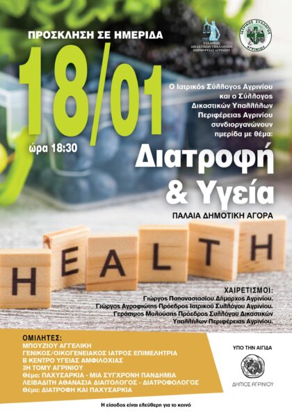 Ο Σύλλογος Δικαστικών Υπαλλήλων Περιφέρειας Αγρινίου σε συνεργασία με τον Ιατρικό Σύλλογο Αγρινίου διοργανώνουν ημερίδα με θέμα: «Διατροφή και Υγεία».