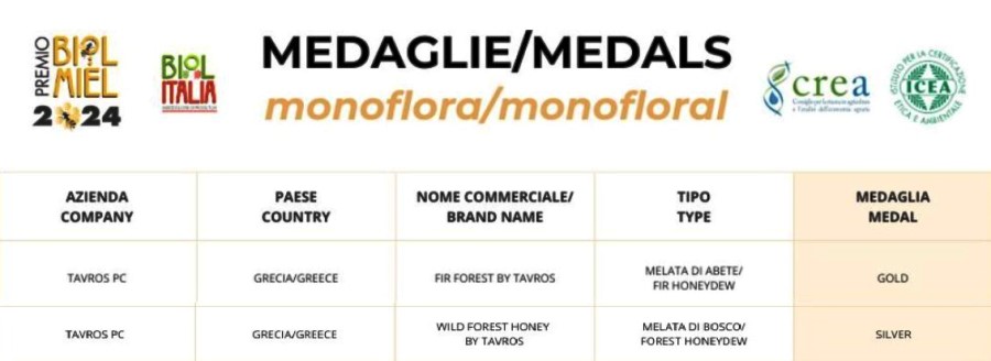 Συγκεκριμένα, η “Τavros Honey” απέσπασε στο διεθνή διαγωνισμό βιολογικών μελιών BIOL MIEL 2024 για το Βιολογικό μέλι ελάτης – Χρυσό βραβείο και για το Βιολογικό μέλι Wild Forest – Ασημένιο βραβείο.