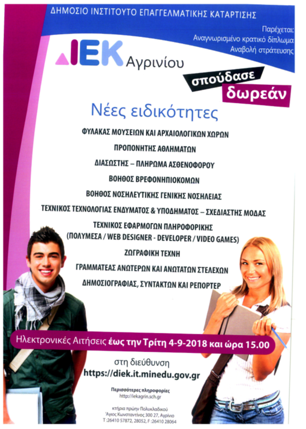 Το ΔΙΕΚ Αγρινίου ενημερώνει πως οι ηλεκτρονικές Αιτήσεις εγγραφής στις νέες ειδικότητες των ΔΙΕΚ που θα ξεκινήσουν τον Οκτώβριο γίνονται στη διεύθυνση https://diek.it.minedu.gov.gr/ και ολοκληρώνονται την Τρίτη 4 Σεπτεμβρίου 2018 και ώρα 15.00.