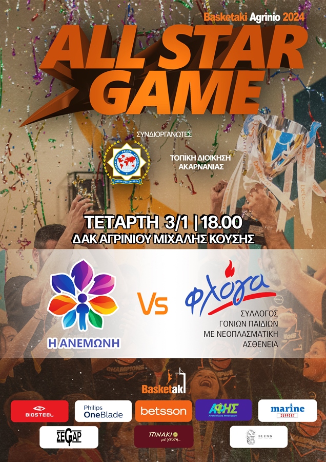 Ο αγώνας θα πραγματοποιηθεί στο κλειστό γήπεδο μπάσκετ του Δ.Α.Κ Αγρινίου στις 18:00. Θα λάβουν μέρος δύο ομάδες που θα σχηματιστούν από τους καλύτερους παίκτες του πρωταθλήματος Basketaki. Η μια ομάδα θα λάβει το όνομα ΑΝΕΜΩΝΗ και η άλλη το όνομα ΦΛΟΓΑ. Ο αγώνας θα είναι αφιερωμένος στους δυο αντίστοιχους συλλόγους της περιοχής μας που ο ένας στηρίζει τα παιδιά με αυτισμό και ο άλλος τα παιδιά με καρκίνο.