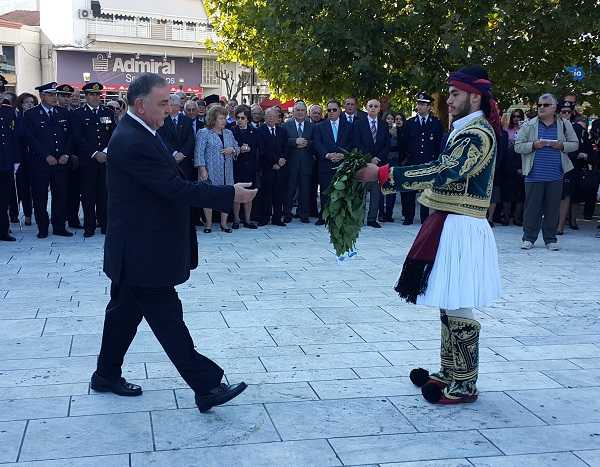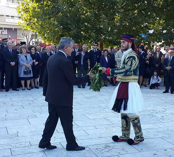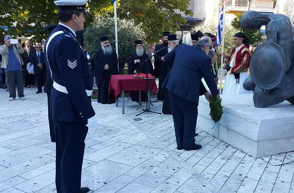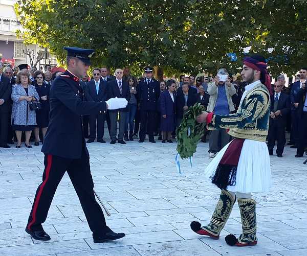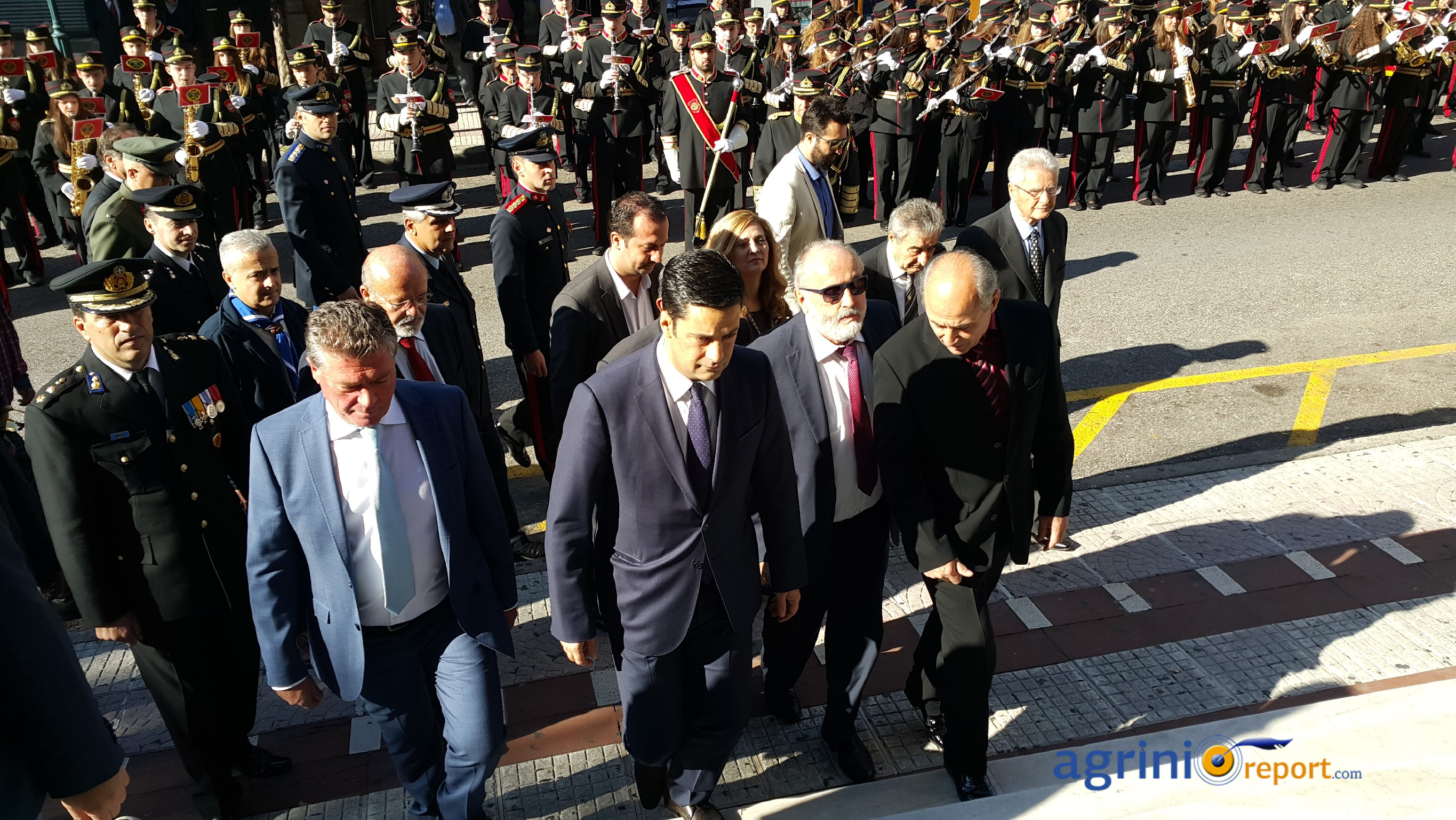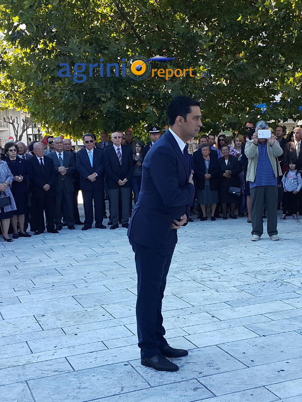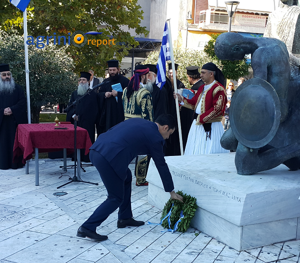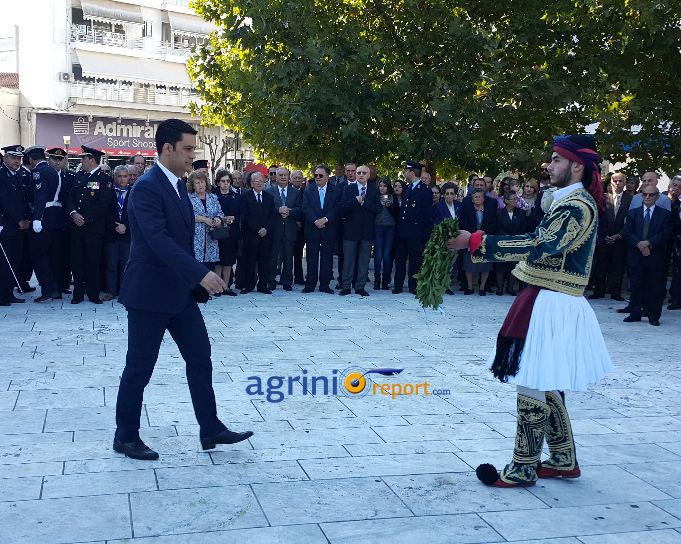Κατόπιν, πραγματοποιήθηκε κατάθεση στεφάνων από τις Αρχές στο μνημείο των πεσόντων στην πλατεία Δημάδη με την Φιλαρμονική Ορχήστρα του Δήμου Αγρινίου να παιανίζει.
