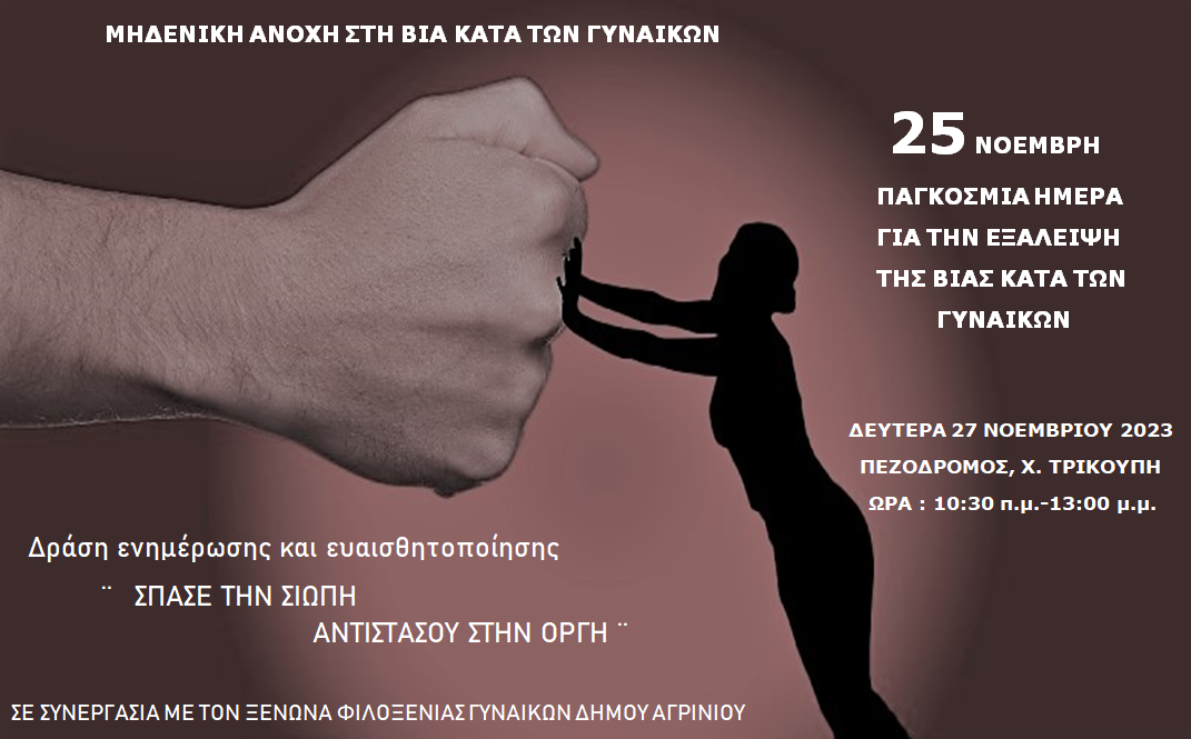 Ο Δήμος Ι.Π. Μεσολογγίου με τις κοινωνικές δομές του Κέντρο Κοινότητας με Παράρτημα Ρομά και Κοινωνικό Παντοπωλείο του Αυτοτελούς Τμήματος Κοινωνικής Προστασίας Παιδείας και Πολιτισμού σε συνεργασία με τον Ξενώνα Φιλοξενίας Γυναικών Δήμου Αγρινίου θα πραγματοποιήσουν δράση ενημέρωσης – ευαισθητοποίησης με αφορμή την παγκόσμια ημέρα για την εξάλειψη της Βίας κατά των Γυναικών, καθώς και τα ανησυχητικά, αυξανόμενα κρούσματα περιστατικών βίας σε όλο τον κόσμο.