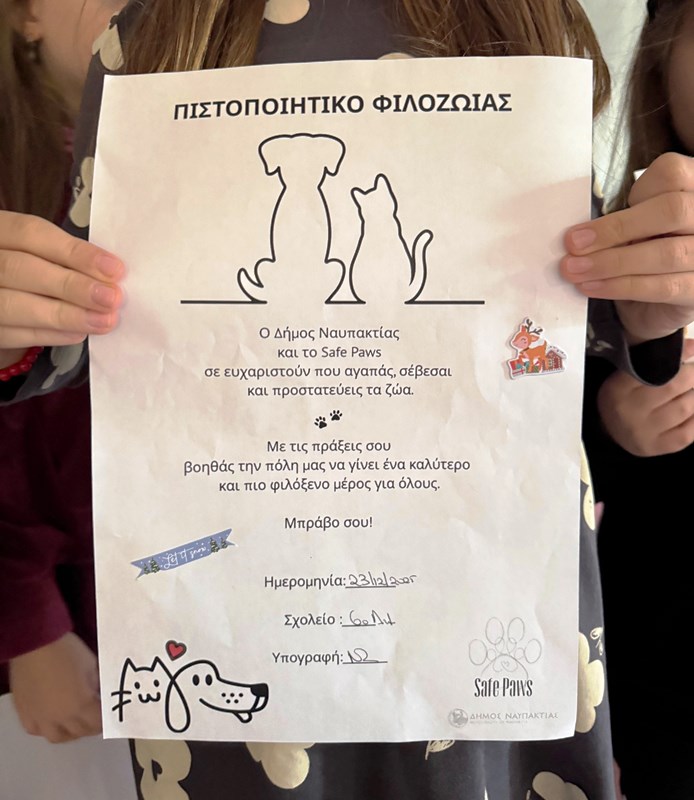 Ο Δήμος Ναυπακτίας ενημερώνει ότι, το Τμήμα Αδέσποτων Ζώων Συντροφιάς «Safe Paws» υλοποίησε δράση ευαισθητοποίησης για τα αδέσποτα ζώα, με τη συμμετοχή δημοτικών σχολείων της περιοχής και συγκεκριμένα του 3ου, 4ου και 6ου Δημοτικού Σχολείου Ναυπάκτου, από τις 18 έως τις 23 Δεκεμβρίου 2025.