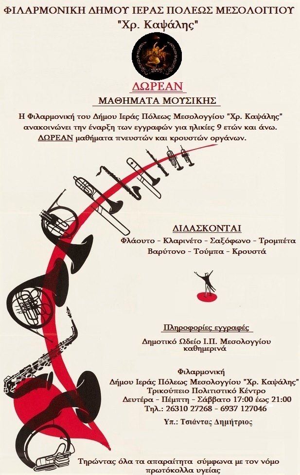 Η Φιλαρμονική του Δήμου Ιεράς Πόλεως Μεσολογγίου «Χρήστος Καψάλης» ανακοινώνει την έναρξη εγγραφών για παιδιά και νέους από 9 και πάνω.