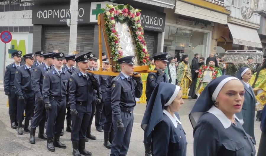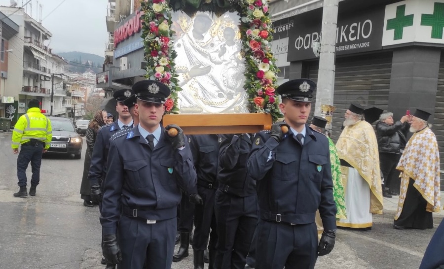 Τριτοετείς Δόκιμοι Αστυφύλακες από την Σχολή Αστυφυλάκων Νάουσας παρέστησαν στην Λιτανεία του Αγίου Αντωνίου Βέροιας που είναι ο πολιούχος της πόλης και μετέφεραν την εικόνα της Παναγίας Δοβρά.