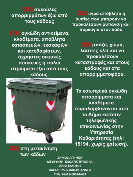- Δεν επιτρέπεται να τοποθετούνται ογκώδη απορρίμματα όπως παλιά έπιπλα, άχρηστες οικιακές συσκευές ή παλιά στρώματα.