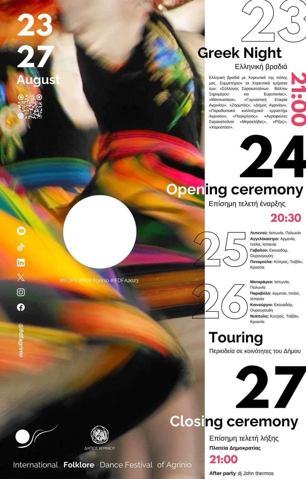 Ο Δήμος Αγρινίου και η Κοινωφελής Επιχείρηση διοργανώνουν και φέτος το Διεθνές Φεστιβάλ Παραδοσιακών Χορών που ξεκινά την Τετάρτη 23 Αυγούστου και θα ολοκληρωθεί την Κυριακή 27 Αυγούστου 2023 .
