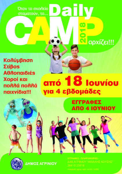 Από τις 18 Ιουνίου και για 4 εβδομάδες διοργανώνεται στο Δημοτικό Αθλητικό Κέντρο Αγρινίου «Μιχάλης Κούσης» το Daily Camp 2018 με προγράμματα κολύμβησης, στίβου, χορού και πολλά παιχνίδια για τα παιδιά ηλικίας 5-12 ετών.
