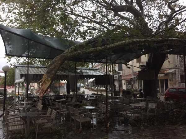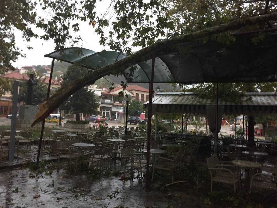 Στο κέντρο του Θέρμου έπεσαν κλωνάρια πλατανιών και παρασύρθηκαν τμήματα από πολλές σκεπές σπιτιών στο Θέρμο, ενώ αναβλήθηκε για την επομένη η συνεδρίαση του Δημοτικού Συμβουλίου που ήταν προγραμματισμένο να ξεκινήσει εκείνη την ώρα.