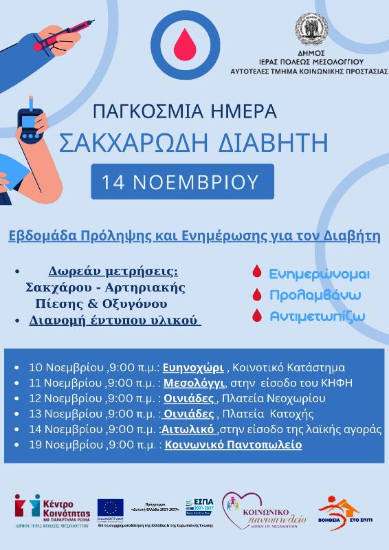 Το Αυτοτελές Τμήμα Κοινωνικής Προστασίας του Δήμου Ιερής Πόλης Μεσολογγίου, σε συνεργασία με το Κέντρο Κοινότητας, το Κοινωνικό Παντοπωλείο και το πρόγραμμα «Βοήθεια στο Σπίτι», διοργανώνει εβδομάδα πρόληψης και ενημέρωσης για τον Σακχαρώδη Διαβήτη, με αφορμή την Παγκόσμια Ημέρα Διαβήτη, που τιμάται στις 14 Νοεμβρίου κάθε χρόνο.
