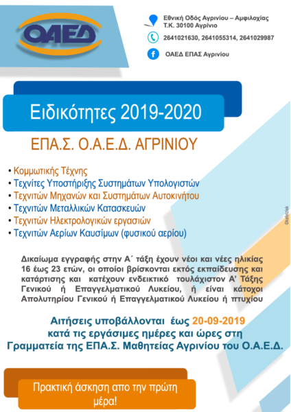 Από την ΕΠΑ.Σ Μαθητείας Αγρινίου του Ο.Α.Ε.Δ. ανακοινώνεται, ότι για το σχολικό έτος 2019-2020 συνεχίζεται η υποβολή αιτήσεων υποψηφίων μαθητών έως την 20-09-2019 στις ακόλουθες ειδικότητες: