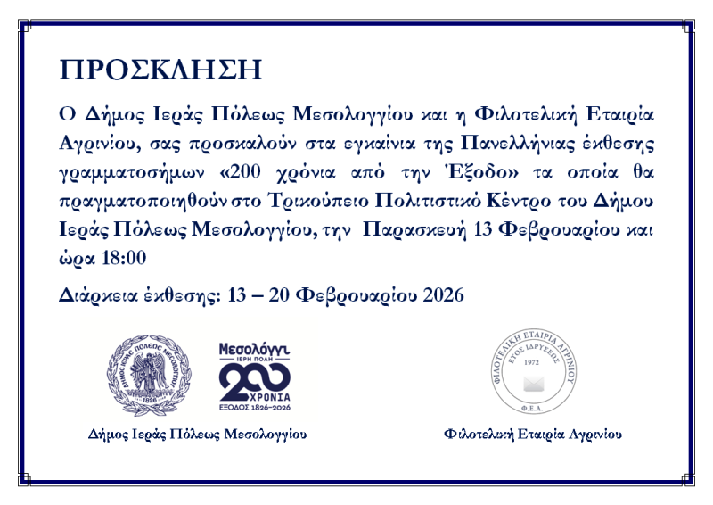 Ο Δήμος Ιεράς Πόλεως Μεσολογγίου και η Φιλοτελική Εταιρία Αγρινίου προσκαλούν όλους τους πολίτες και επισκέπτες της περιοχής να τιμήσουν με την παρουσία τους τα εγκαίνια και να επισκεφθούν την έκθεση.