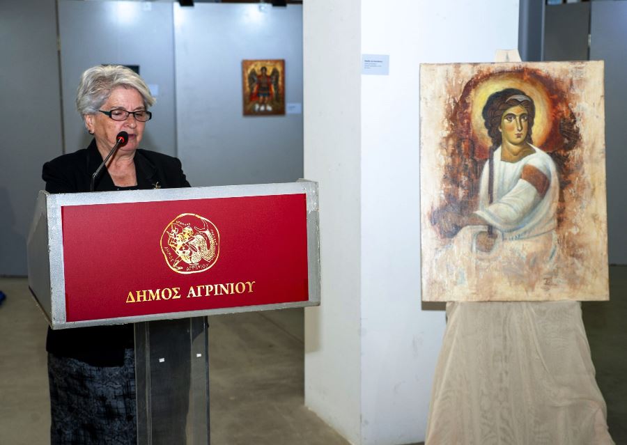 Η κυρία Τσιρώνη καλωσόρισε τους επισκέπτες ευχαριστώντας τον Δήμο Αγρινίου και τον κο Χρήστο Γαρουφαλή για την πολλαπλή στήριξή του στην οργάνωση της έκθεσης. Στη συνέχεια η Θεολόγος κυρία Ευαγγελία Λύσσαρη έκανε γενική αναφορά στο νόημα της βυζαντινής εικονογραφίας συνδυάζοντάς το με τα έργα της έκθεσης τα οποία όπως ανέφερε,μέσω των χρωμάτων, εκφράζουν ευλάβεια και αρμονία και έχουν απώτερο στόχο την πραγμάτωση της καθαρά πνευματικής αποστολής των μορφών.