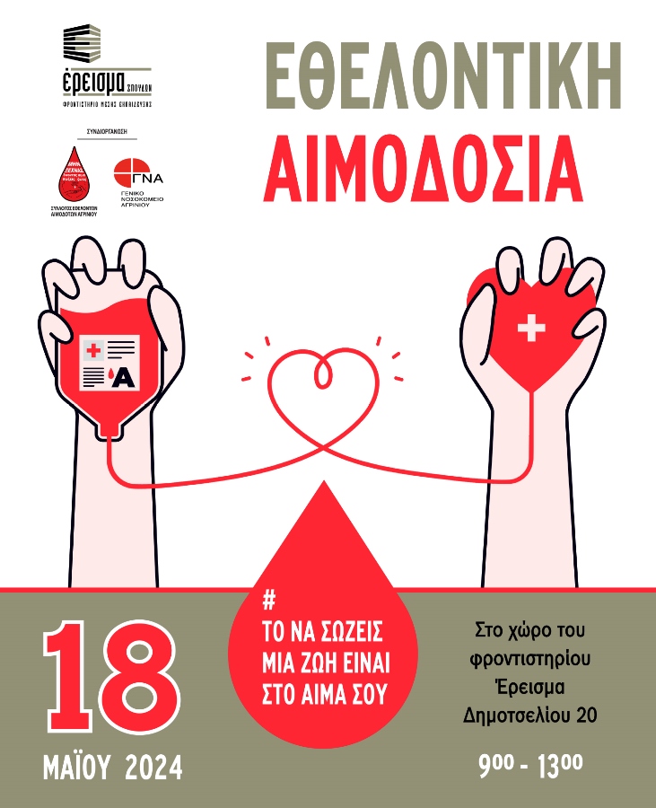 Το ΣΑΒΒΑΤΟ  18  ΜΑΪΟΥ  2024  στο χώρο του φροντιστηρίου «ΕΡΕΙΣΜΑ»,  από τις 9.00 το πρωί μέχρι 1.00 το μεσημέρι ΕΘΕΛΟΝΤΙΚΗ ΑΙΜΟΔΟΣΙΑ.