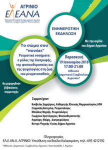 Με κεντρικό μήνυμα το σώμα σου «πονάει» ο Σύλλογος ΕΛΕΑΝΑ, διοργανώνει εκδήλωση ενημέρωσης και ευαισθητοποίησης του κοινού με θέμα:«Ρευματικά Νοσήματα: ο ρόλος της διατροφής, της φυσικοθεραπείας και της ψυχολογίας στη ζωή του ρευματοπαθούς» υπό την αιγίδα του Δήμου Αγρινίου.