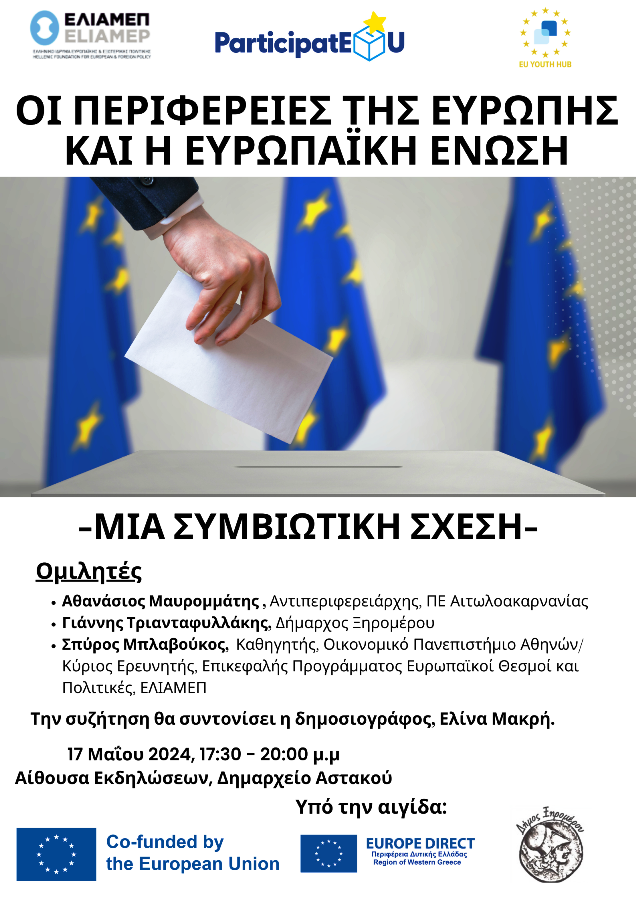 Υπό την αιγίδα του Δήμου Ξηρομέρου και του Europe Direct – Περιφέρεια Δυτικής Ελλάδας, το Ευρωπαϊκό Πρόγραμμα «Αριάν Κοντέλη» του ΕΛΙΑΜΕΠ διοργανώνει εκδήλωση με θέμα «Οι περιφέρειες της Ευρώπης και η ΕΕ: Μια συμβιωτική Σχέση», την Παρασκευή, 17 Μαΐου 2024, στην Αίθουσα Εκδηλώσεων στο Δημαρχείου Αστακού, Αιτωλοακαρνανίας.