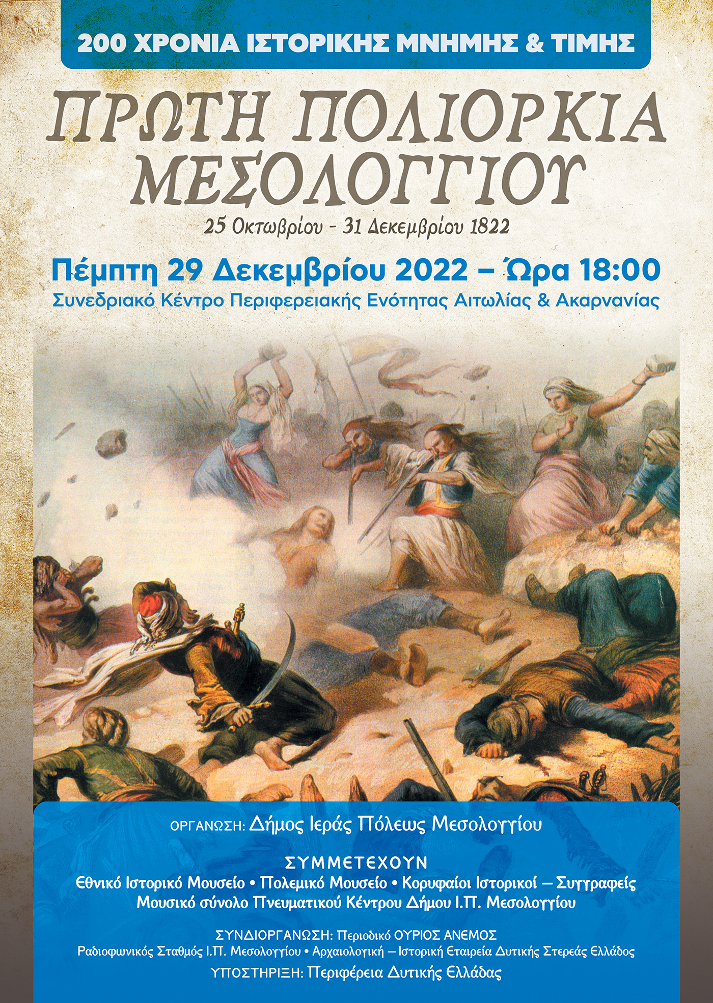 Ο Δήμος Ι.Π. Μεσολογγίου σε συνεργασία με το περιοδικό «Ούριος Άνεμος» το Ραδιοφωνικό Σταθμό Ι.Π. Μεσολογγίου και την Αρχαιολογική – Ιστορική Εταιρία Δυτικής Στερεάς Ελλάδας την Πέμπτη 29 Δεκεμβρίου 2022 και ώρα 18:00 διοργανώνει εκδήλωση ιστορικής μνήμης και τιμής με τίτλο: «200 Χρόνια Πρώτης Πολιορκίας Μεσολογγίου».