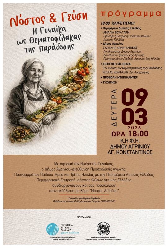 Η Διεύθυνση Προσχολική Αγωγής, Προγραμμάτων Παιδιού, ΑμεΑ και Τρίτης Ηλικίας του Δήμου Αγρινίου, σε συνεργασία με την Περιφέρεια Δυτικής Ελλάδας και την Περιφερειακή Επιτροπή Ισότητας Φύλων Δυτικής Ελλάδας, διοργανώνουν εκδήλωση με τίτλο «Νόστος & Γεύση – Η Γυναίκα ως Θεματοφύλακας της Παράδοσης», με αφορμή την Ημέρα της Γυναίκας.