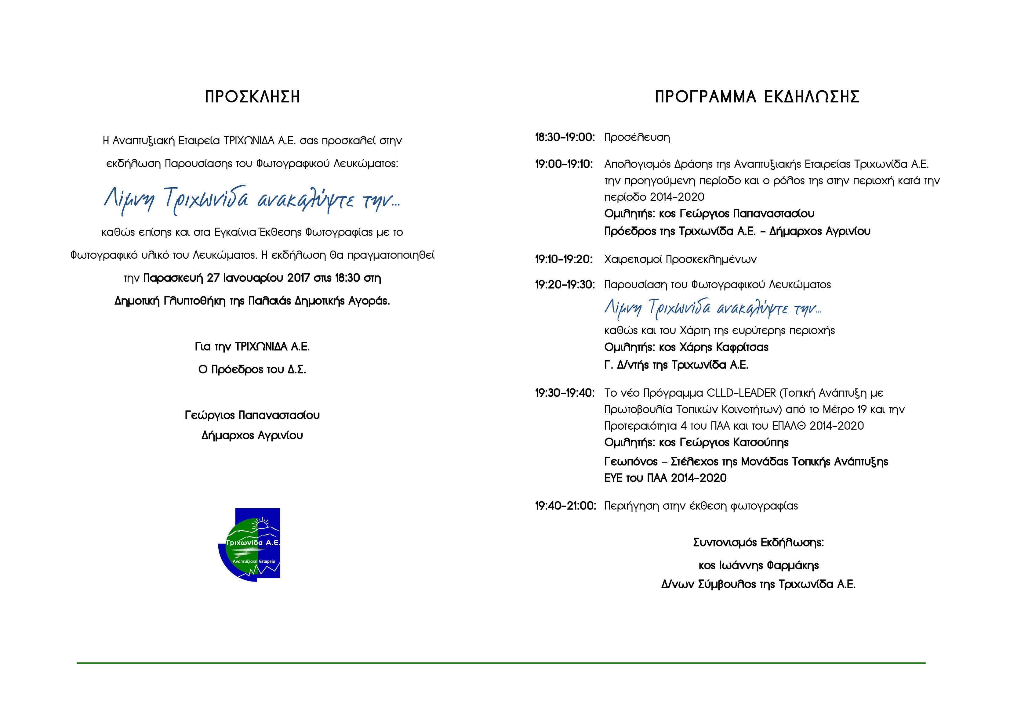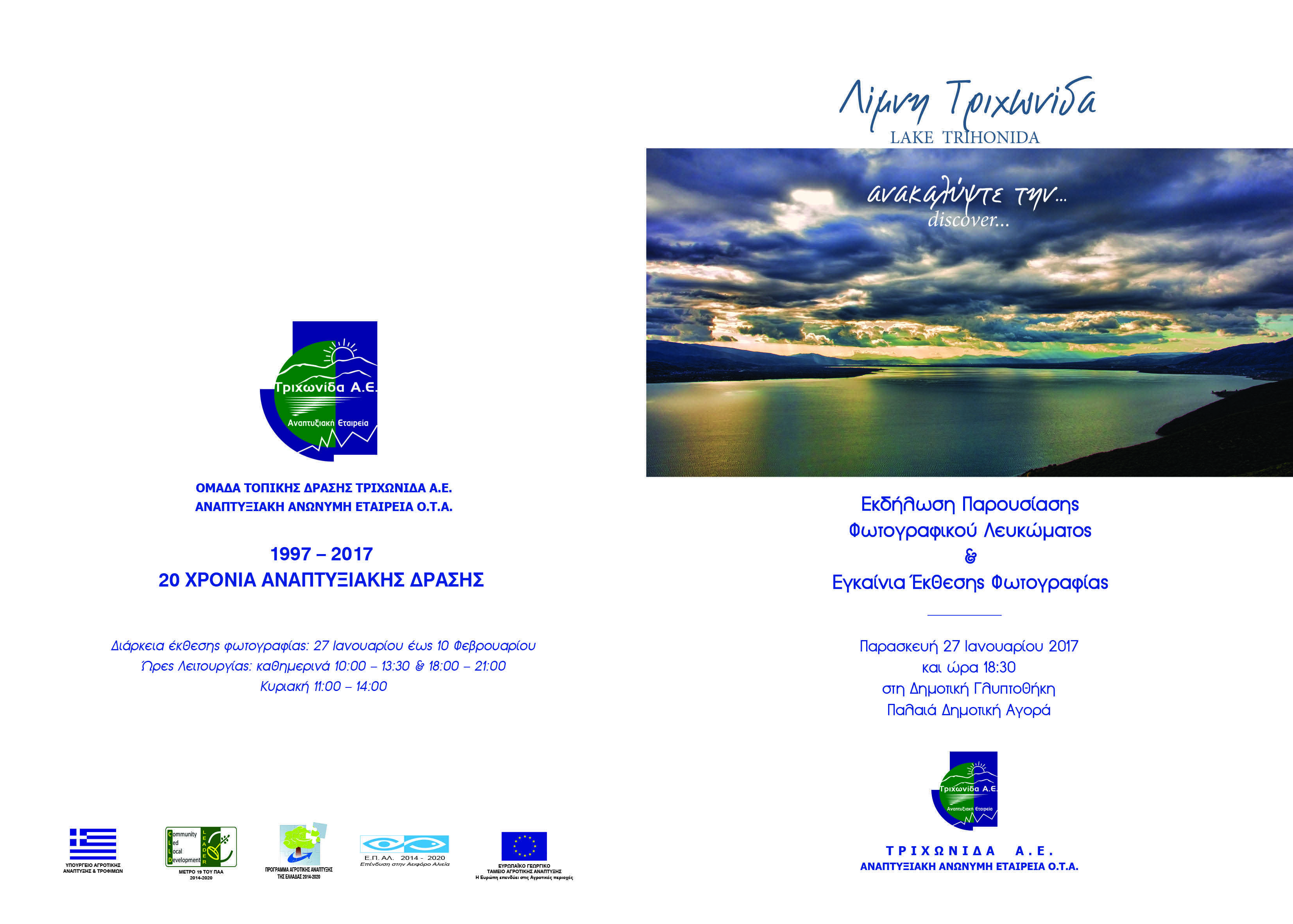 Τα εγκαίνια έκθεσης φωτογραφίας καθώς και η παρουσίαση Λευκώματος με θέμα την Λίμνη Τριχωνίδα θα λάβουν χώρα την Παρασκευή 27 Ιανουαρίου στις 18:30 στην Παλαιά Δημοτική Αγορά στην Δημοτική Γλυπτοθήκη.