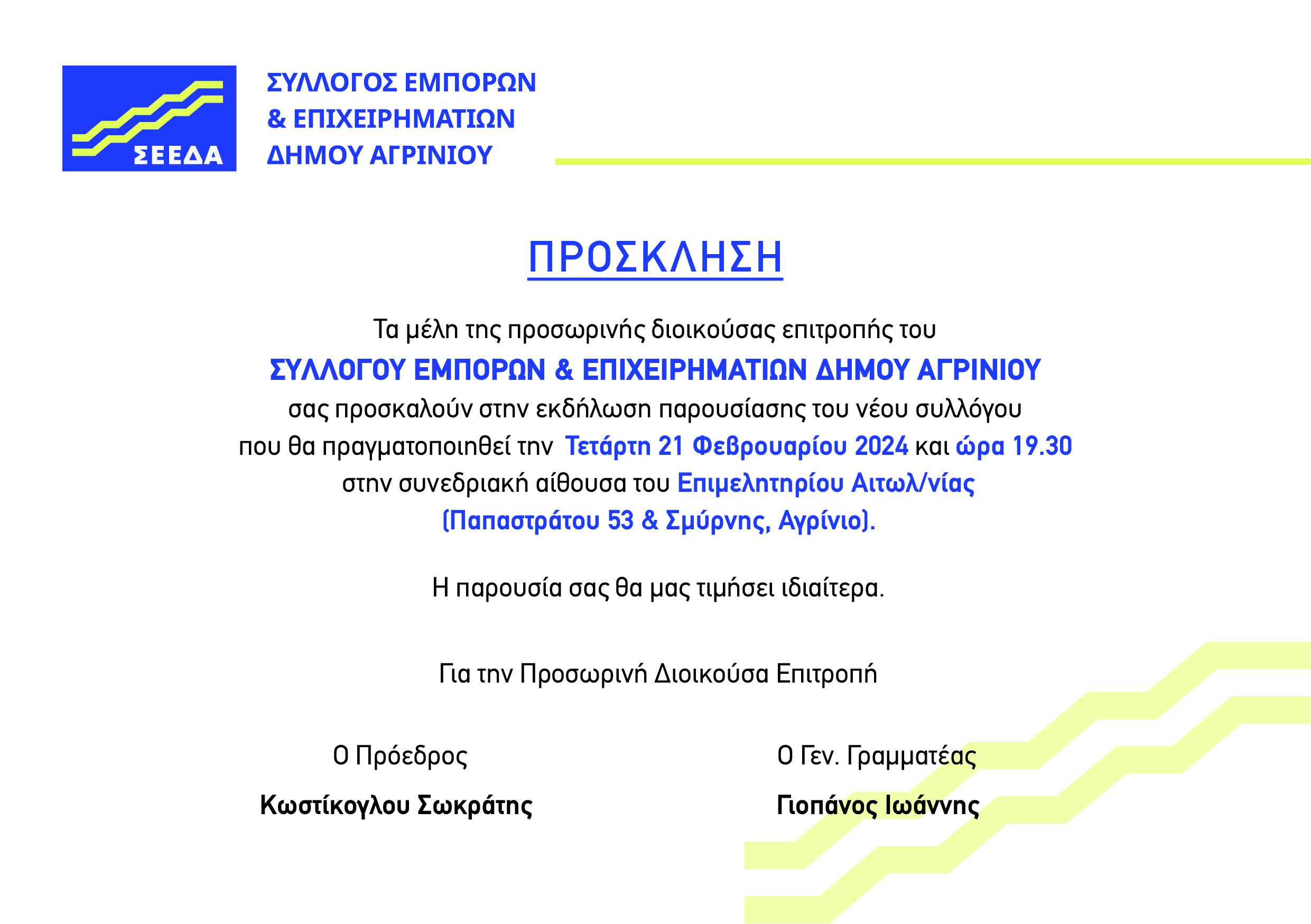 Τα μέλη της προσωρινής διοικούσας επιτροπής του ΣΥΛΛΟΓΟΥ ΕΜΠΟΡΩΝ & ΕΠΙΧΕΙΡΗΜΑΤΙΩΝ ΔΗΜΟΥ ΑΓΡΙΝΙΟΥ σας προσκαλούν στην εκδήλωση παρουσίασης του νέου συλλόγου που θα πραγματοποιηθεί την Τετάρτη 21 Φεβρουαρίου 2024 και ώρα 19.30 στην συνεδριακή αίθουσα του Επιμελητηρίου Αιτωλ/νίας (Παπαστράτου 53 & Σμύρνης, Αγρίνιο).