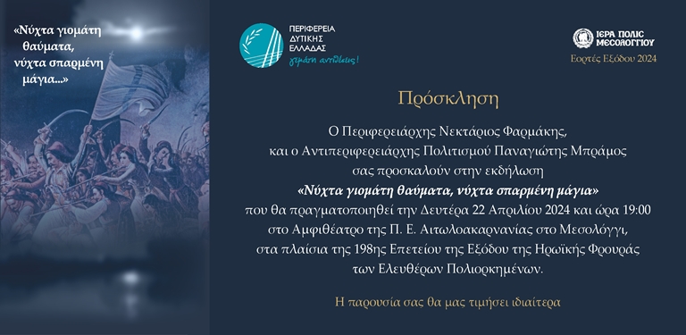 Σας προσκαλούμε στην εκδήλωση “Νύχτα γιομάτη θαύματα, νύχτα σπαρμένη μάγια” που διοργανώνει η Περιφέρεια Δυτικής Ελλάδας και η οποία είναι αφιερωμένη στην Έξοδο των Ελεύθερων Πολιορκημένων.Η εκδήλωση θα πραγματοποιηθεί τη Δευτέρα, 22 Απριλίου 2024 και ώρα 7:00 μ.μ. στο αμφιθέατρο της Π.Ε. Αιτωλοακαρνανίας στο Μεσολόγγι.