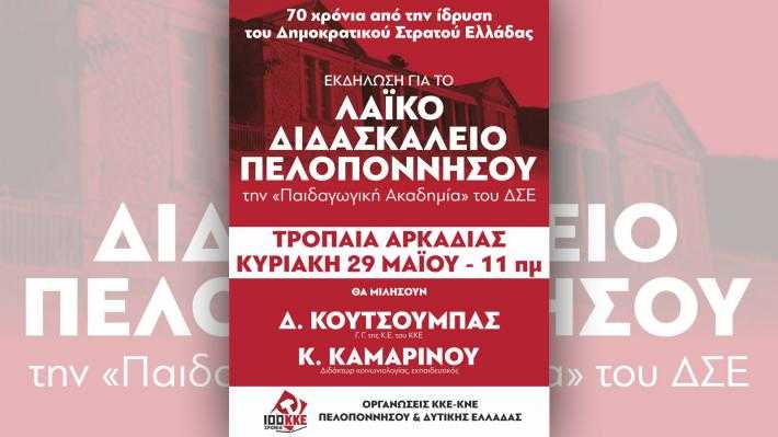 Οι παραπάνω εκδηλώσεις γίνονται στα πλαίσια των δραστηριοτήτων που αναπτύσσονται με αφορμή την εκδήλωση της ΚΕ του ΚΚΕ για το Λαϊκό Διδασκαλείο Πελοποννήσου. Η εκδήλωση αυτή θα πραγματοποιηθεί στα Τρόπαια Αρκαδίας την Κυριακή 29 Μάη. Στην εκδήλωση αυτή θα μιλήσει ο Δημήτρης Κουτσούμπας, ΓΓ της ΚΕ του ΚΚΕ και η Κυριακή Καμαρινού, διδάκτωρ Κοινωνιολογίας.