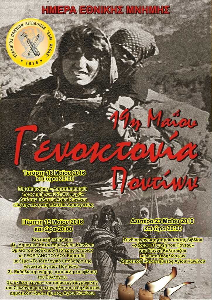 Ο Σύλλογος Ποντίων Αιτ/νίας “Δημ. Ψαθάς” ανακοινώνει το πρόγραμμα εκδηλώσεων, που σχετίζονται με την Ποντιακή Γενοκτονία όπως παρακάτω: