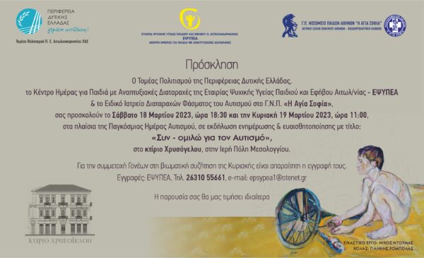 Ο Τομέας Πολιτισμού της ΠΔΕ –ΠΕ Αιτωλοακαρνανίας, το Κέντρο Ημέρας για Παιδιά με Αναπτυξιακές Διαταραχές της Εταιρίας Ψυχικής Υγείας Παιδιού και Εφήβου Αιτωλοακαρνανίας –ΕΨΥΠΕΑ και το Ειδικό Ιατρείο Διαταραχών Φάσματος του Αυτισμού του Γ.Ν.Π «Η Αγία Σοφία», στο πλαίσιο της Παγκόσμιας Ημέρας Αυτισμού, διοργανώνουν διήμερη εκδήλωση ενημέρωσης και ευαισθητοποίησης, με τίτλο «Συν-ομιλώ για τον Αυτισμό», το Σαββατοκύριακο 18 και 19 Μαρτίου 2023 στο κτίριο Χρυσόγελου , στην Ιερή Πόλη Μεσολογγίου.