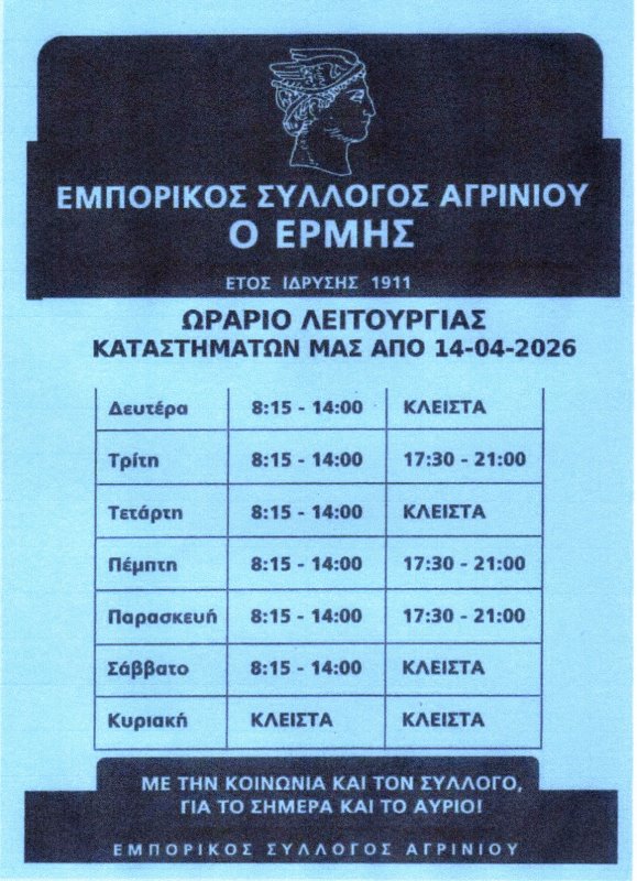 Εμπορικός Σύλλογος Αγρινίου : Το ωράριο των καταστημάτων από 14-04-2026