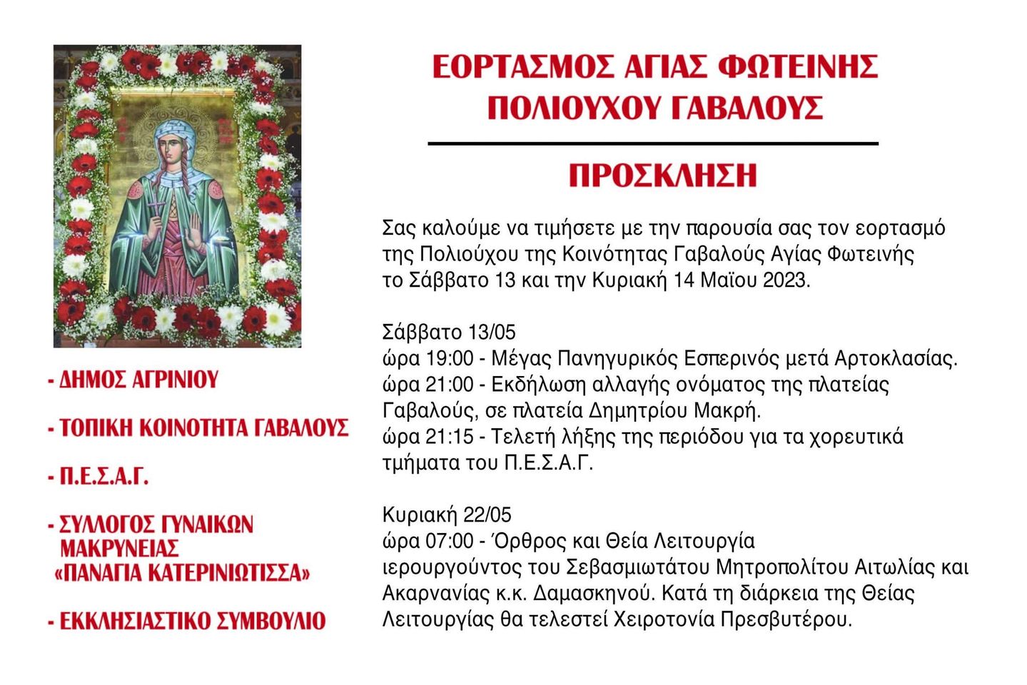 Εορτασμός Αγίας Φωτεινής Πολιούχου Γαβαλούς-Πρόγραμμα
