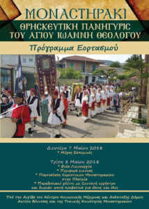 Την Τρίτη 8 Μαΐου θα τελεστεί η Θεία λειτουργία και περιφορά της εικόνας του Αγίου Ιωάννη. Στην συνέχεια χορευτικά τμήματα από το Μοναστηράκι θα παρουσιάσουν παραδοσιακούς χορούς στην κεντρική πλατεία του χωριού.