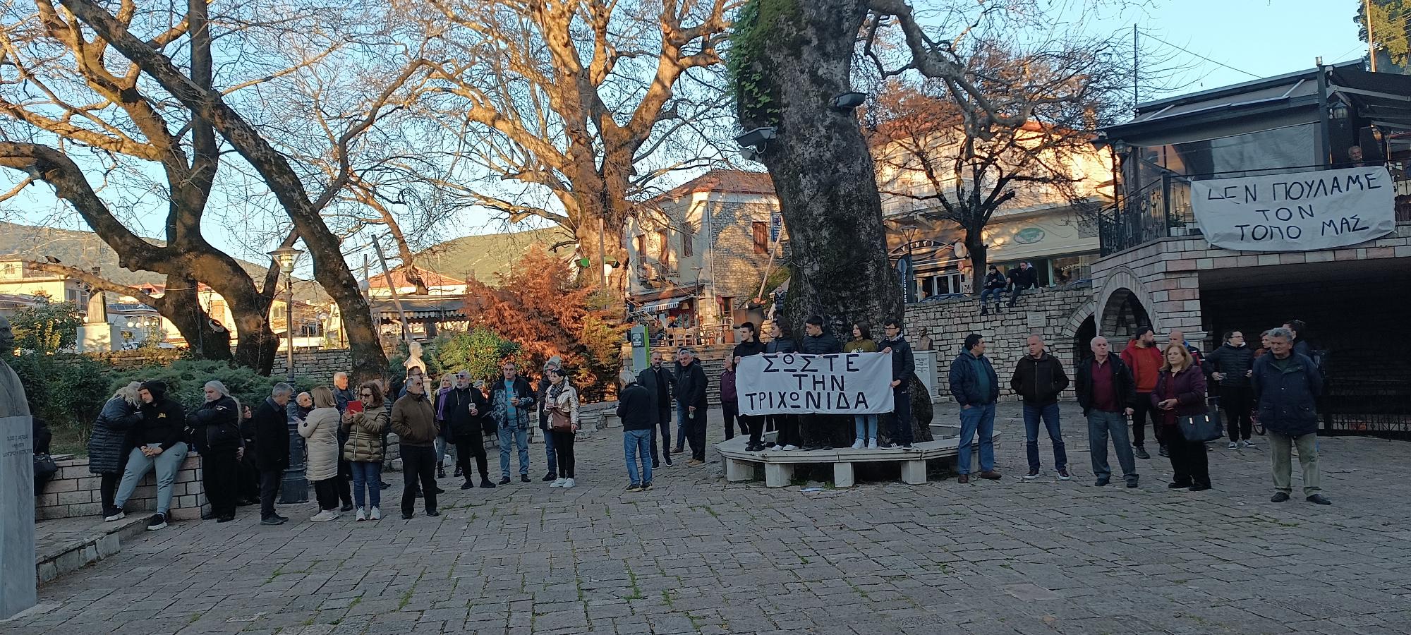 Η κινητοποίηση ενεργών πολιτών , φορεών και ομάδων που αντιδρούν στο φαραωνικό αυτό έργο ξεκίνησε πριν την έναρξη της εκδήλωσης στον αύλειο χώρο του Δημαρχείου Θέρμου με πανό που αναγράφουν «Κάτω τα χέρια σας απο την Τριχωνίδα», «Σώστε την Τριχωνίδα» και «Δεν πουλάμε τον τόπο μας».