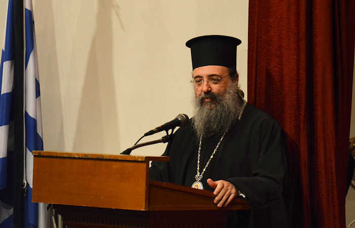 Προηγήθηκε ομιλία του Σεβασμιωτάτου Μητροπολίτου Πατρών κ. Χρυσοστόμου, ο οποίος ευχαρίστησε τον Σεβ. Ποιμενάρχη μας κ. Κοσμά για την πρόσκληση, ενώ με τον πατριωτικό και λυρικό του λόγο καθήλωσε το πλήθος του ακροατηρίου. Μίλησε για την ανεπανάληπτη Θυσία, την ιστορική Δόξα και τον επάξιο Ύμνο του Μεσολογγίου, τονίζοντας ότι: