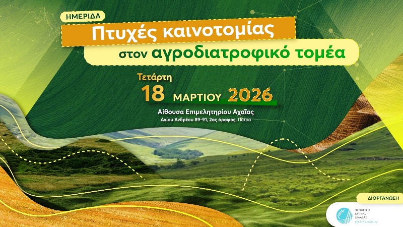 Ημερίδα με τίτλο «Πτυχές καινοτομίας στον αγροδιατροφικό τομέα» θα πραγματοποιηθεί την Τετάρτη 18 Μαρτίου 2026 στις 9:30 στην Αίθουσα του Επιμελητηρίου Αχαΐας, συγκεντρώνοντας εκπροσώπους της επιστημονικής κοινότητας, της αυτοδιοίκησης και της επιχειρηματικότητας, με στόχο την ανάδειξη σύγχρονων τεχνολογικών και ερευνητικών εφαρμογών που ενισχύουν την ανάπτυξη του αγροδιατροφικού κλάδου.