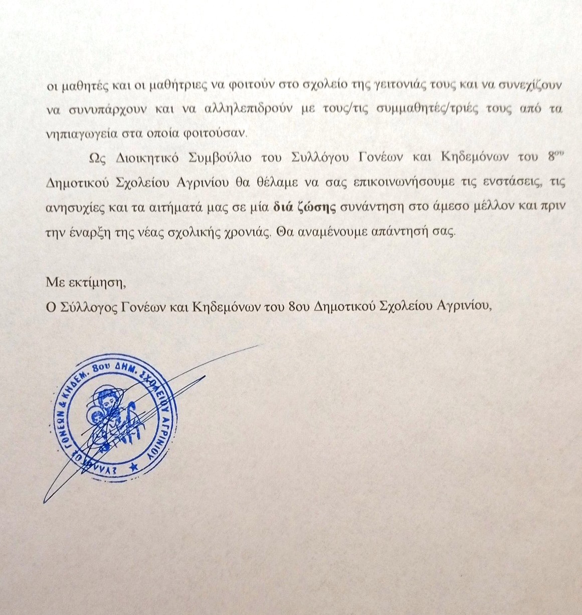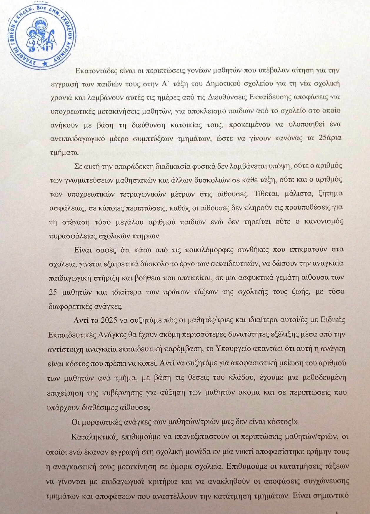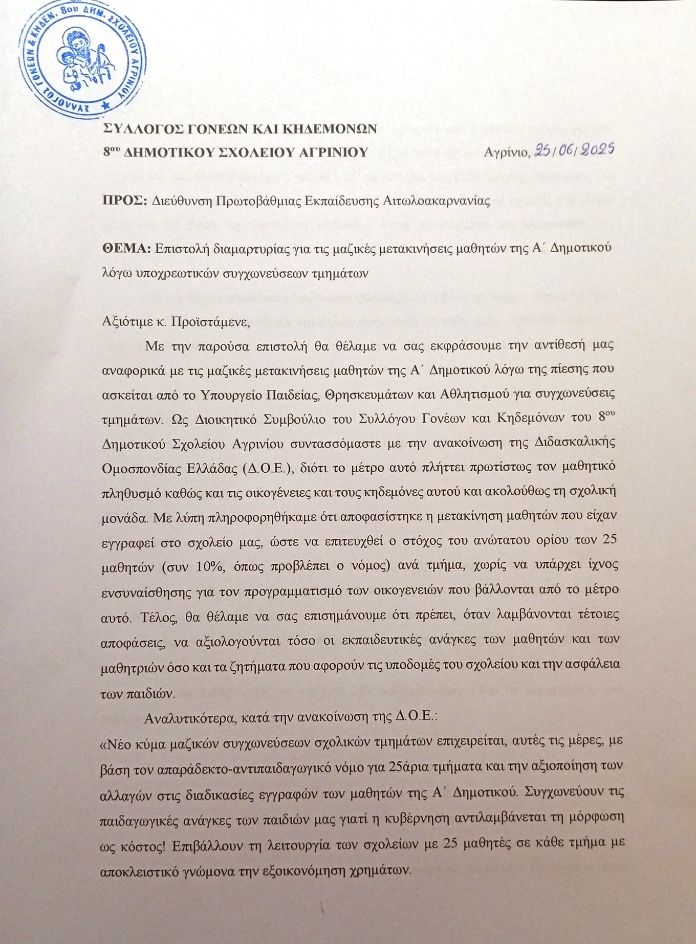 Ακολουθεί η επιστολή διαμαρτυρίας για τις μαζικές μετακινήσεις μαθητών της Α΄ Δημοτικού λόγω υποχρεωτικών συγχωνεύσεων τμημάτων του Συλλόγου Γονέων & Κηδεμόνων Α΄ Τάξης 8ου Δημοτικού Σχολείου Αγρινίου.