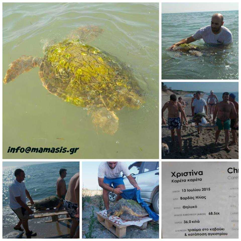 Άμεσα στήθηκε γέφυρα σωτηρίας για την μεταφορά της από την παραλία στα ΚΤΕΛ Βάρδας και την αποστολή με λεωφορείο στην Αθήνα για το Κέντρο Περίθαλψης του Αρχέλων. Η Caretta ήταν τραυματισμένη στο κεφάλι, διαπιστώθηκε η παρουσία αγκιστριού στον οισοφάγο όπου υποβλήθηκε σε χειρουργική επέμβαση για την αφαίρεση του. Η Caretta caretta φέρει το όνομα «Χριστίνα» όπως και το μικρό όνομα της νεαρής κοπέλας που βρήκε το τραυματισμένο ζώο ενώ πολύ σύντομα θα είναι έτοιμη για την απελευθέρωση της.