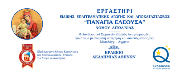 Τα Κέντρα Διημέρευσης Ημερήσιας Φροντίδας (ΚΔΗΦ) του Εργαστηρίου «ΠΑΝΑΓΙΑ ΕΛΕΟΥΣΑ», στο Μεσολόγγι και Αγρίνιο παρέχουν πιστοποιημένες ποιοτικές υπηρεσίες (ποιοτικό σύστημα «ΕQUASS EXCELLENCE») στους εκπαιδευομένους του, με απώτερο σκοπό την ανάπτυξη των ατομικών και κοινωνικών τους δεξιοτήτων, την κοινωνικοποίηση και την κοινωνική τους ένταξη, για τη βελτίωση της ποιότητας ζωής τους. Για πληροφορίες μπορείτε να επισκεφθείτε την ιστοσελίδα μας www.ergpanel.gr.